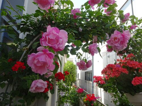 今日もまだ咲いている バラの写真から行きま す。 朝起きて、窓を開けて バラのアーチを見るの が今は一番の楽しみで す。 朝ごはんを食べると午前 中は庭仕事です。 花がら摘み、花の植替え、水やり等毎日仕事が絶え ません。 バラのある庭だけでな く、玄…
